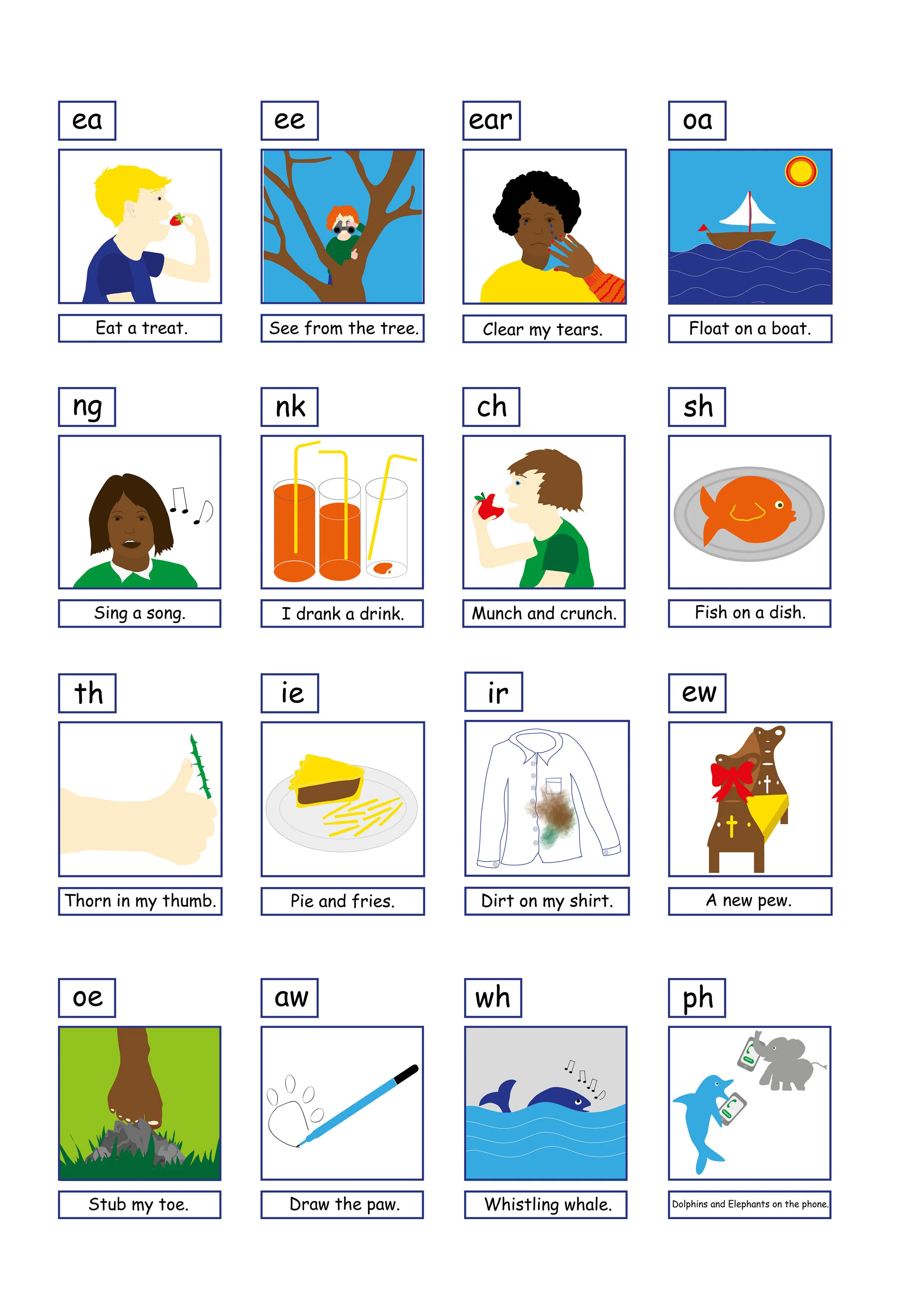 Phonics scheme designed for Cameley Way Primary School. Phrases were given to me by the school and the images were shown to students who gave feedback on how well the communicated the sounds. I created a range of classroom resources for the school.